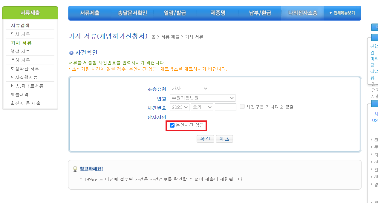 본안사건 없음을 체크하고 확인해줍니다.