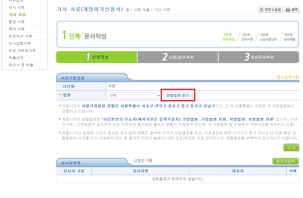 자 이제 본격적으로 개명을 진행하는데 먼저 관할법원을 찾아서 선택해줍니다.