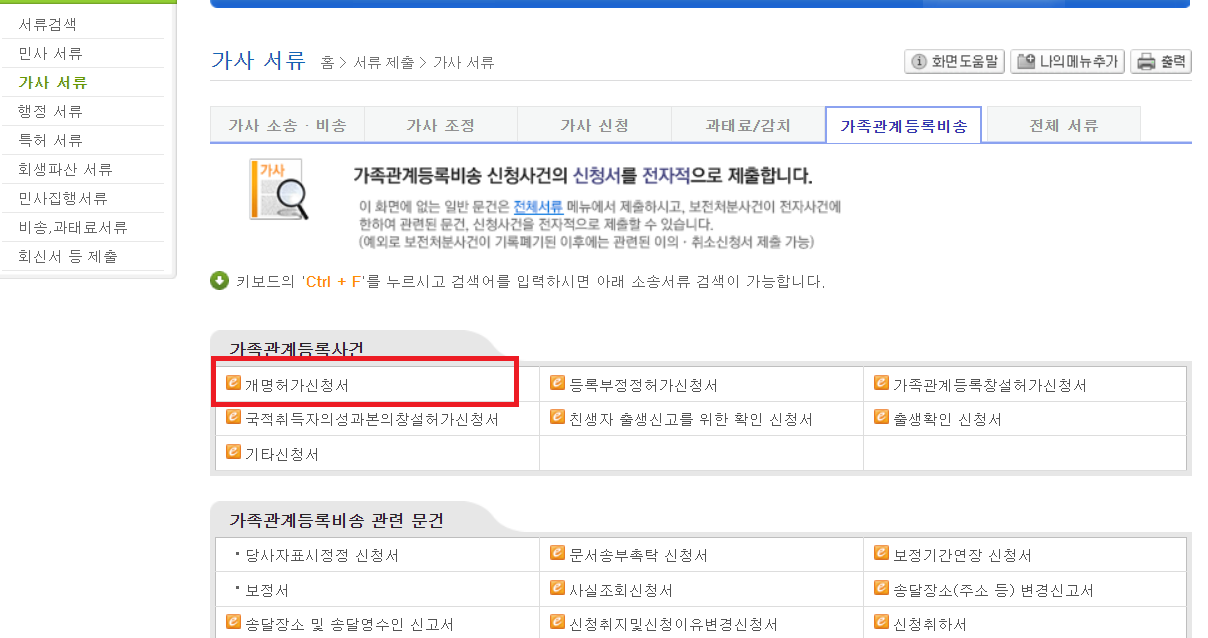 가족관계등록비송탭에서 개명허가신청서를 클릭해줍니다.