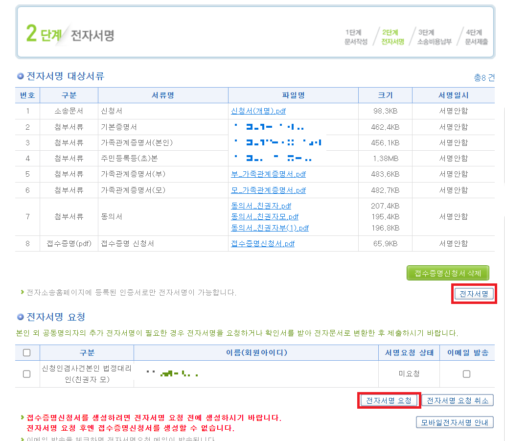 이때 주의할 점은 법정대리인(부)만 입력을 하니깐 2인의 전자서명이 필요하다는 팝업이 뜨더라구요.