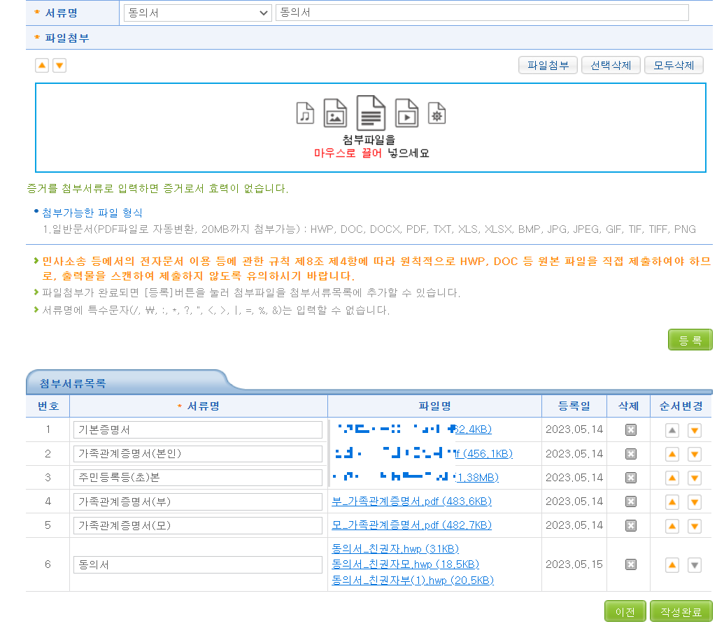 자 이제 다음으로 넘어면 소명서류가 아닌 쭉 아래에 있는 첨부서류를 첨부하는 곳이 있습니다.