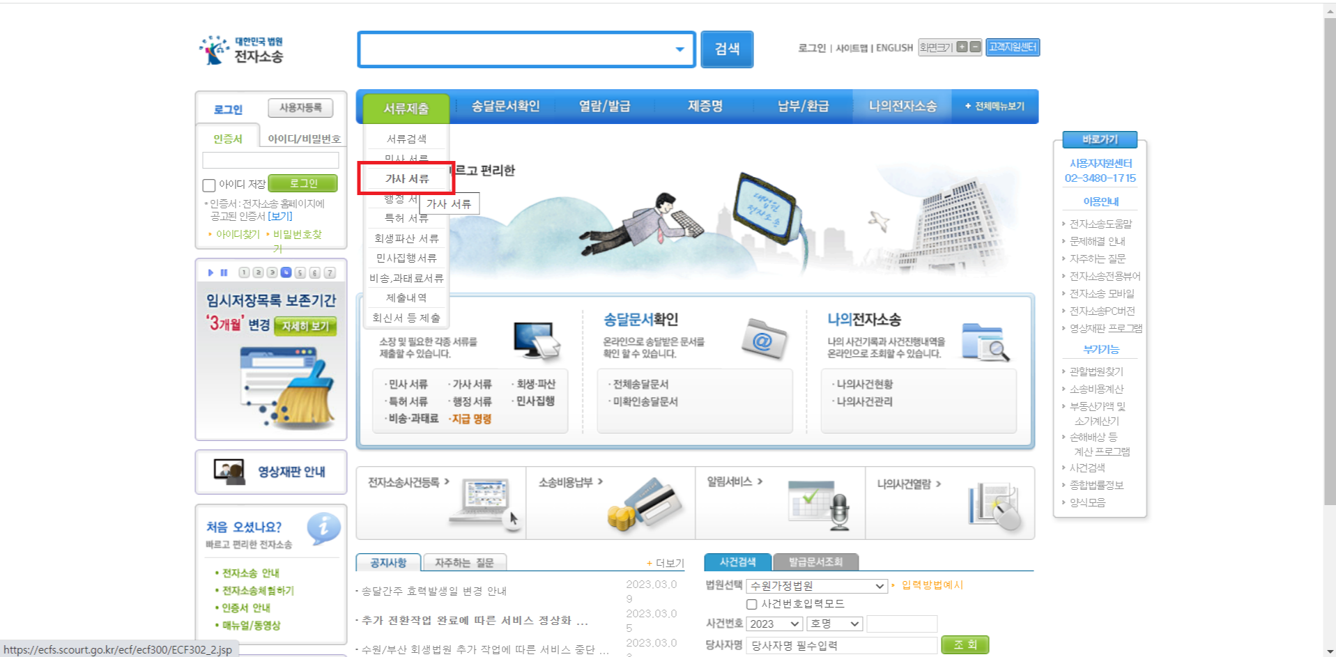 다 끝나면 우측상단에 나의 소송>진행중사건에 1이라고 표시되는 것을 확인 할 수 있어요.