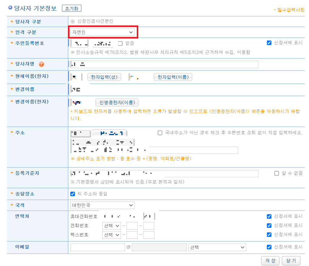 이제 당사자 정보부터 하나씩 채워주면 되는데 인격 구분을 자연인으로 선택해야 하는 것 말고는 어렵지 않게 채울 수 있더라구요.