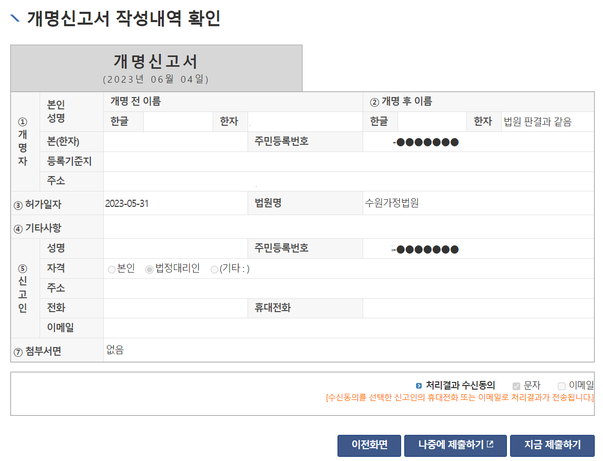 작성을 하고 나면 개명신고서 작성내역을 확인 해주고 제출을 해줍니다.