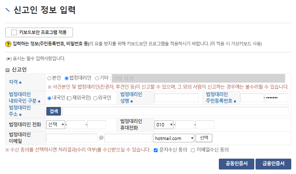 신고인 정보에 미성년자 개명이기 때문에 법정대리인을 선택한 후 법정대리인 정보를 입력해줍니다.