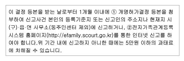 결정등본에 1개월 이내에 신고하지 아니한 때에는 5만원 이하의 과태료가 처해질 수 있다는 무시무시한 말이 써있습니다.