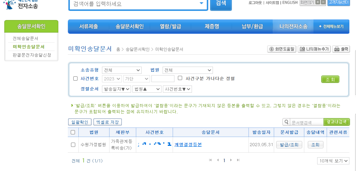 그러면 송달문서확인에 미확인송달문서를 확인할 수 있습니다.