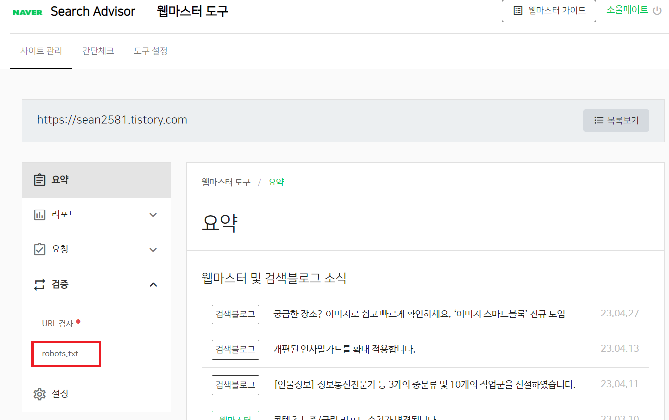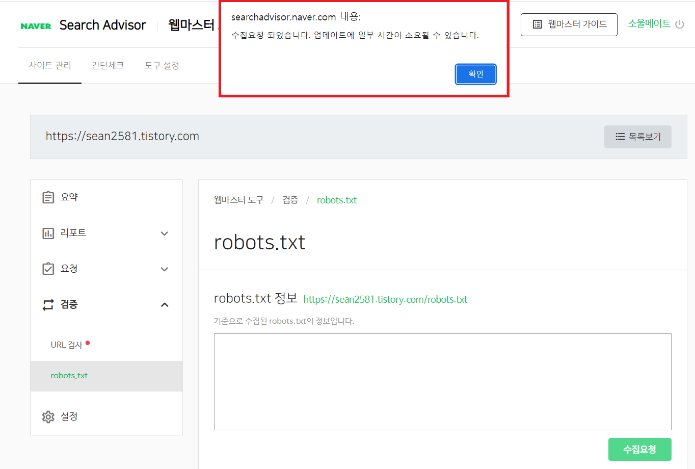 다시 네이버 서치어드바이저로 돌아와서 robots.txt 검증에서 사이트주소에 /robots.txt를 써준 후 확인을 클릭합니다.