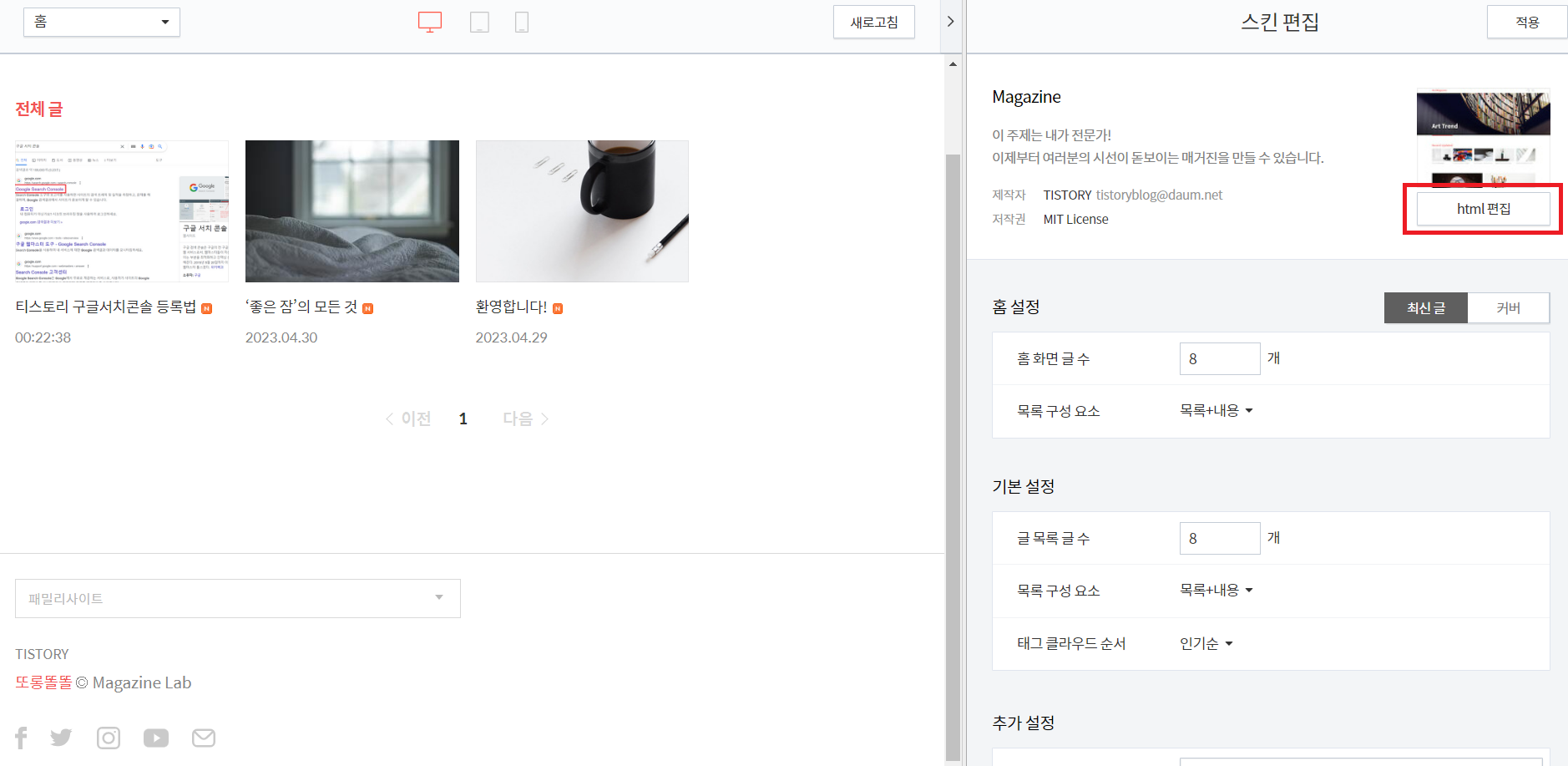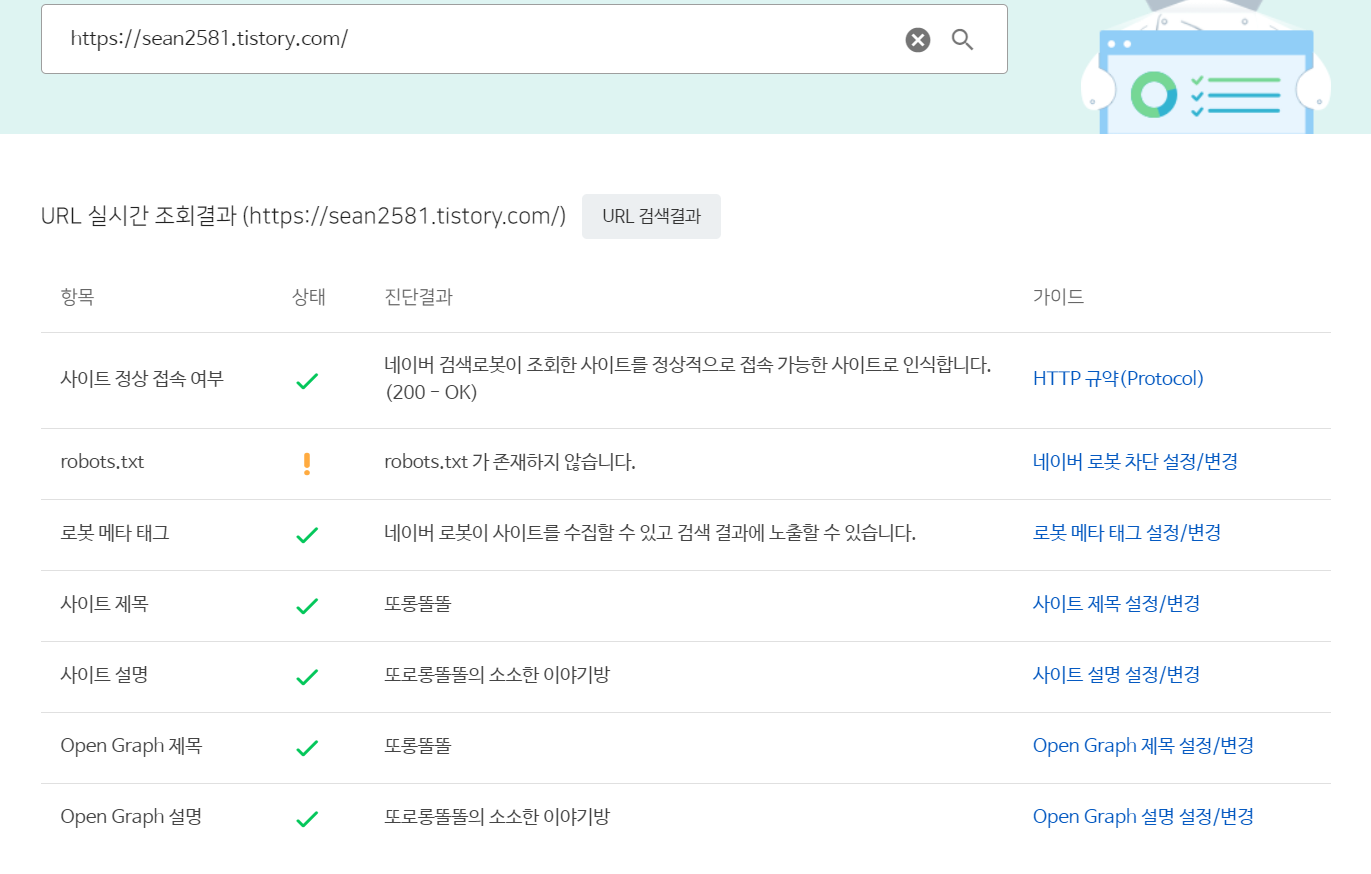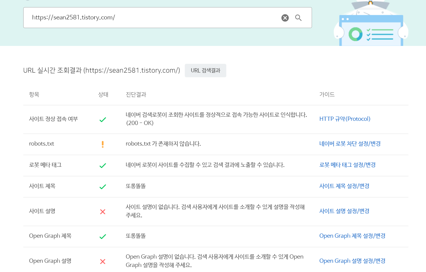 그래서 상태가 정상인 티스토리를 만들기 위해 하나씩 정상으로 바꿔보겠습니다.