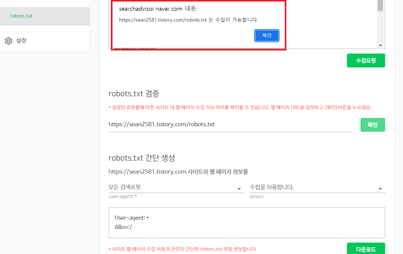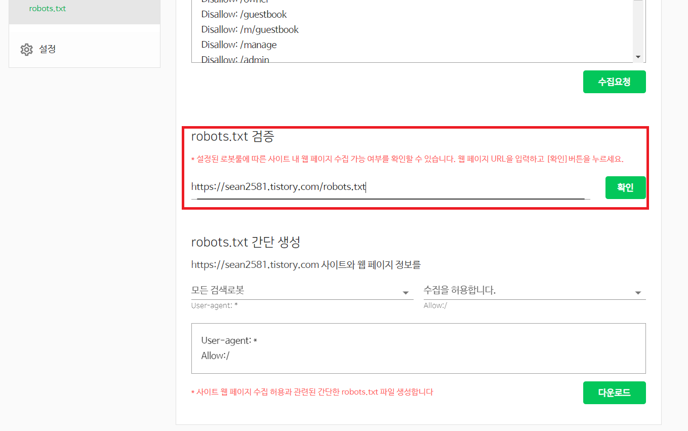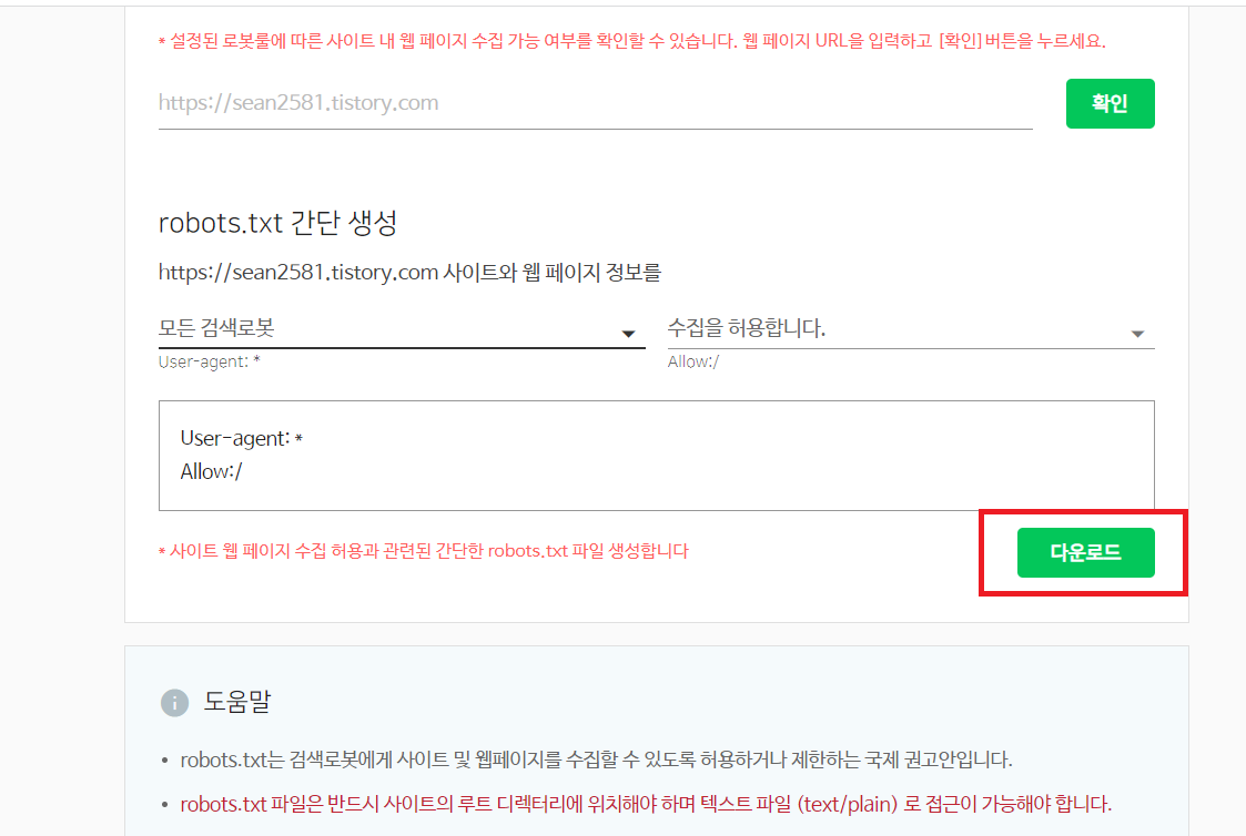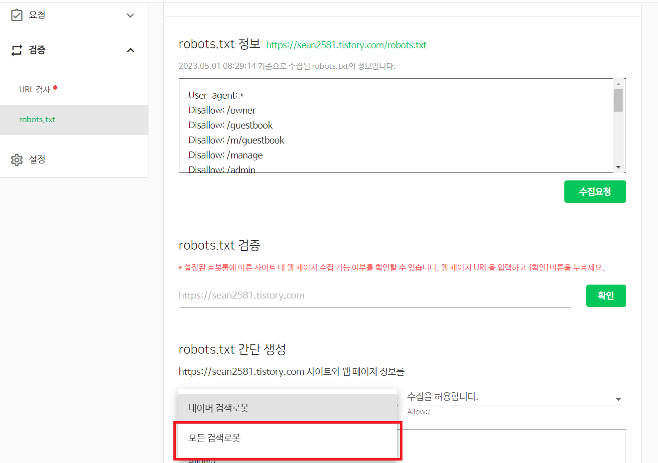 아래쪽에 보면 robots.txt 간단 생성이 있는데 모든 검색로봇으로 체크합니다.