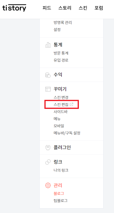 티스토리 관리의 꾸미기 메뉴에서 스킨 편집을 클릭합니다.