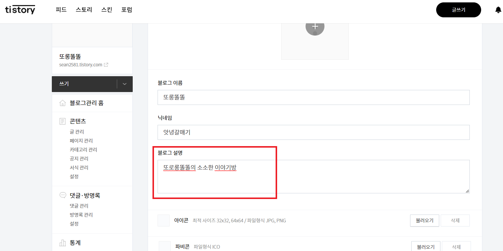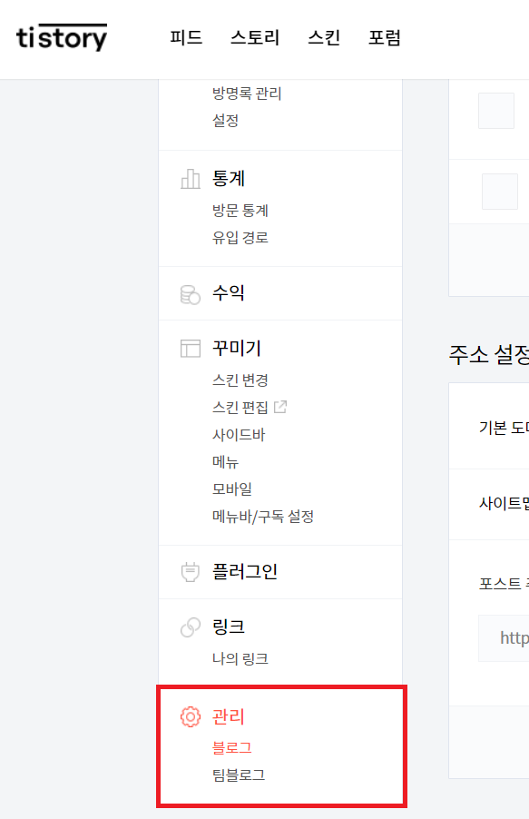 먼저 티스토리 관리의 관리에서 블로그를 클릭해줍니다.