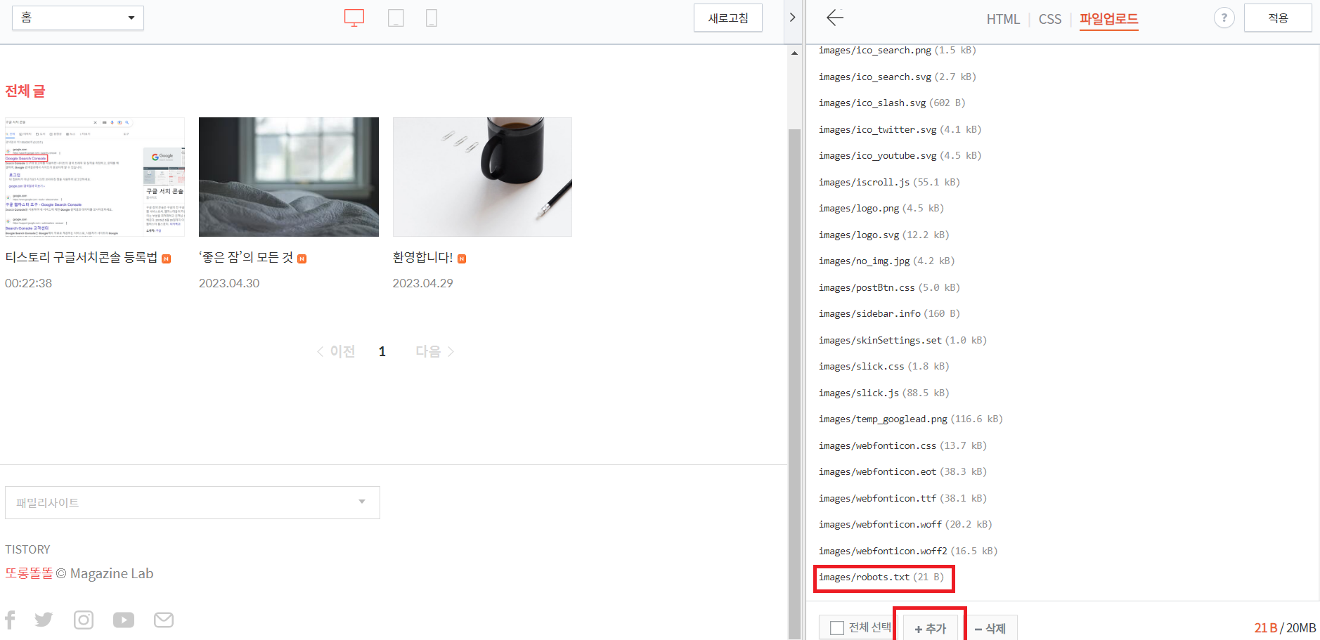 하단에 추가버튼으로 방금 다운받은 robots.txt 파일을 추가해줍니다.